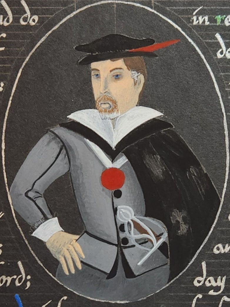 Roland has a late-period persona, as many rapier fighters do, since the fencing manuals that have survived to present day generally come from the late 1500s. I knew I wanted to include a portrait of Roland (which may have been part of the commission request, I can no longer recall), but beyond that I wasn't certain at first what I would do with layout and so on.