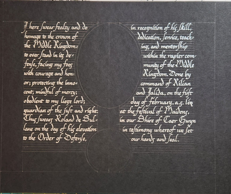 And here we are with the finished scroll. Roland was wearing this exact outfit and received this sword on the day of his elevation, and he found me afterward to express his thanks. I may have been able to erase the pencil lines, but I was concerned about smudging the silver and the ciphers. All in all though, this is a scroll I was happy to do, and I'm pleased with the result.